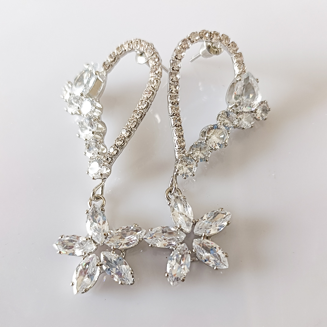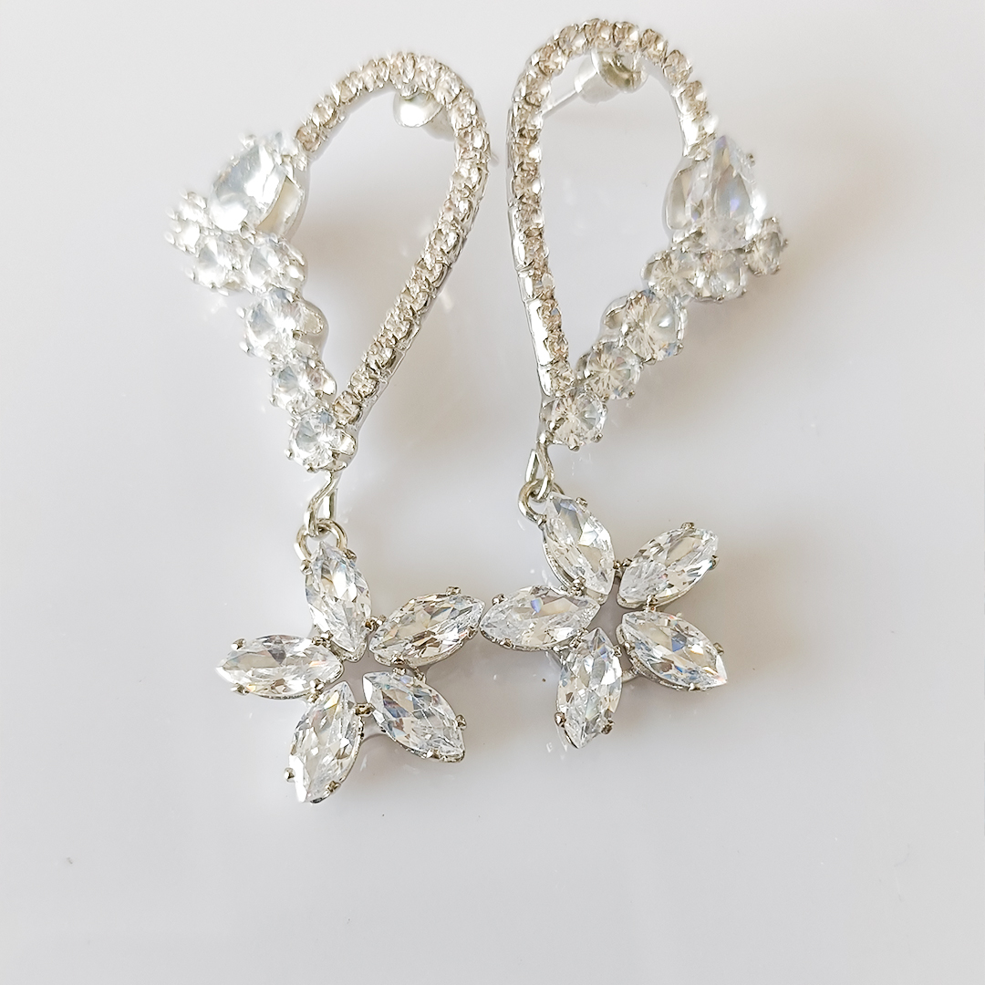 Elevate your look with these stunning Crystalline Floral Drop Statement Earrings, a perfect blend of captivating movement and brilliant sparkle. These beautiful earrings feature a curved pave-set crystal loop that hugs the ear, from which a dazzling five-petal crystal flower gracefully dangles. The design is intricate and modern, catching the light from every angle to ensure all eyes are on you.