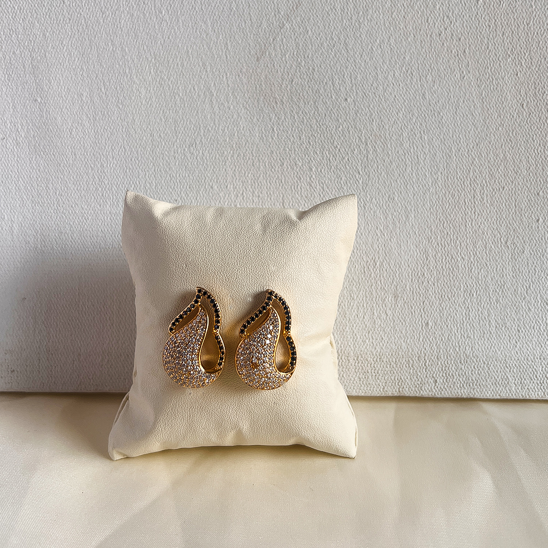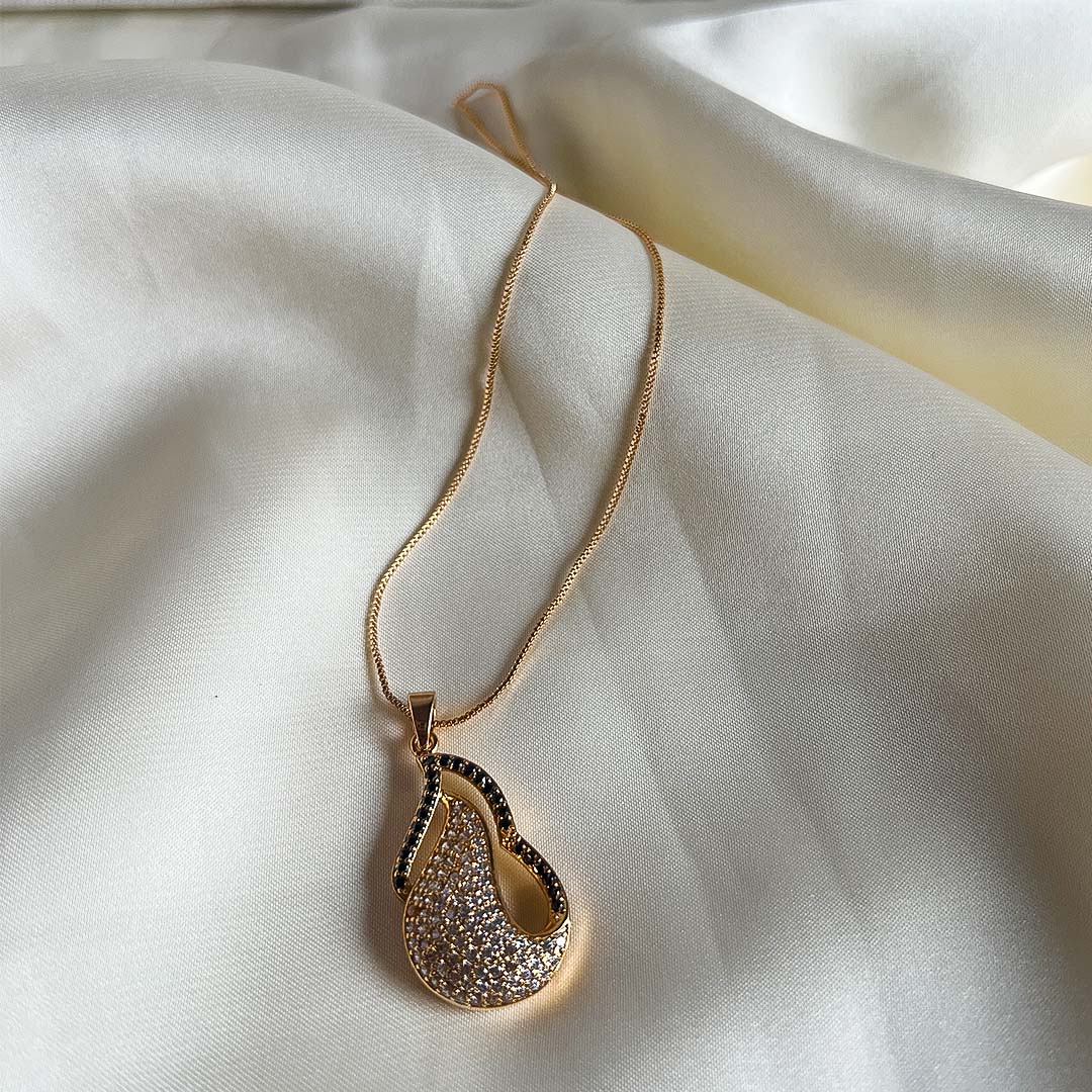 Elevate your look with this stunning Midnight Ember Teardrop Jewelry Set, a perfect blend of sophisticated design and brilliant sparkle. This exquisite set features a matching pendant necklace and stud earrings, each showcasing a unique flame or teardrop-inspired design. One section of the curve is adorned with deep black crystals, while the larger portion gleams with brilliant white micro-crystals, creating a striking contrast that catches the light from every angle. The rich gold-toned setting adds a luxurious finish to this captivating ensemble.