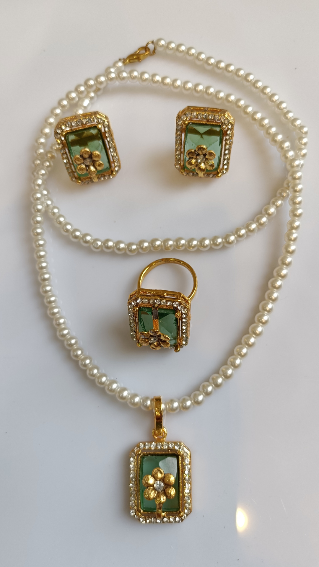 Elevate your look with this stunning Mughal Green Stone & Pearl Collar Set, a perfect blend of historic elegance and modern grace. This beautiful set features a classic pearl choker/collar necklace adorned with three captivating gold-toned square pendants. Each pendant showcases a polished deep green stone with a delicate floral motif at its center, all framed by brilliant micro-crystals. The matching square ring completes this regal ensemble.