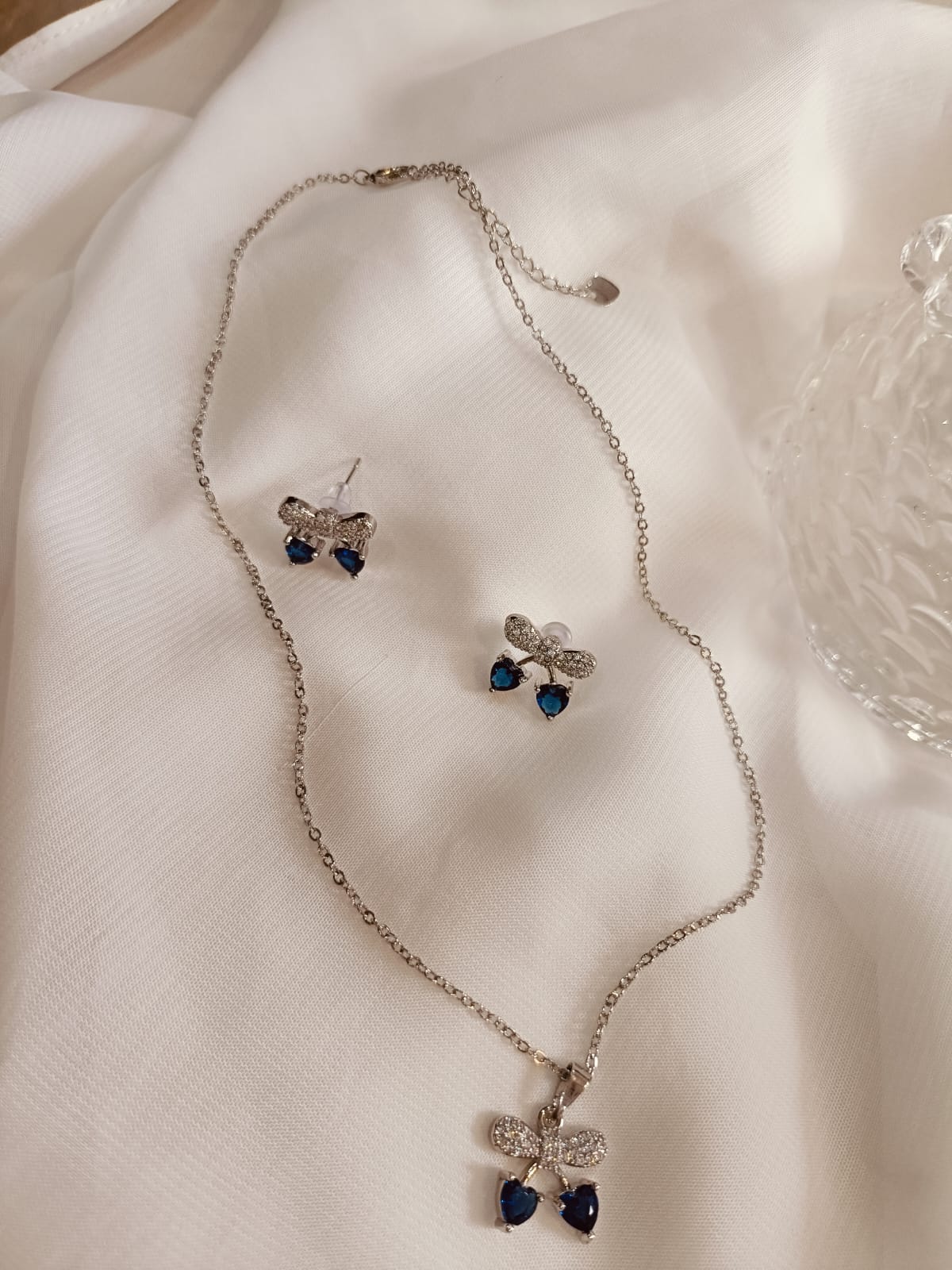Elevate your look with this stunning Sapphire Bowknot Heart Jewelry Set, a perfect blend of feminine charm and sparkling elegance. This beautiful set features a delicate chain necklace and matching stud earrings, each designed as an adorable crystal-paved bowknot with two deep sapphire-blue heart crystals dangling below. The silver-toned setting enhances the brilliance of the stones, giving the set a sweet yet sophisticated appeal.