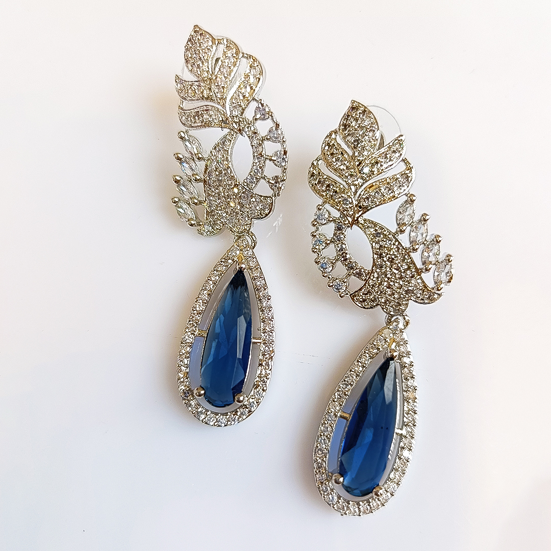 The bright silver-toned setting beautifully emphasizes the rich color of the sapphire stone, creating a glamorous, high-end look. These dramatic earrings are designed to sway beautifully with movement, instantly catching the light and making you the focus of any room. They are an essential accessory for weddings, gala events, or any grand occasion where you want to feel truly special.