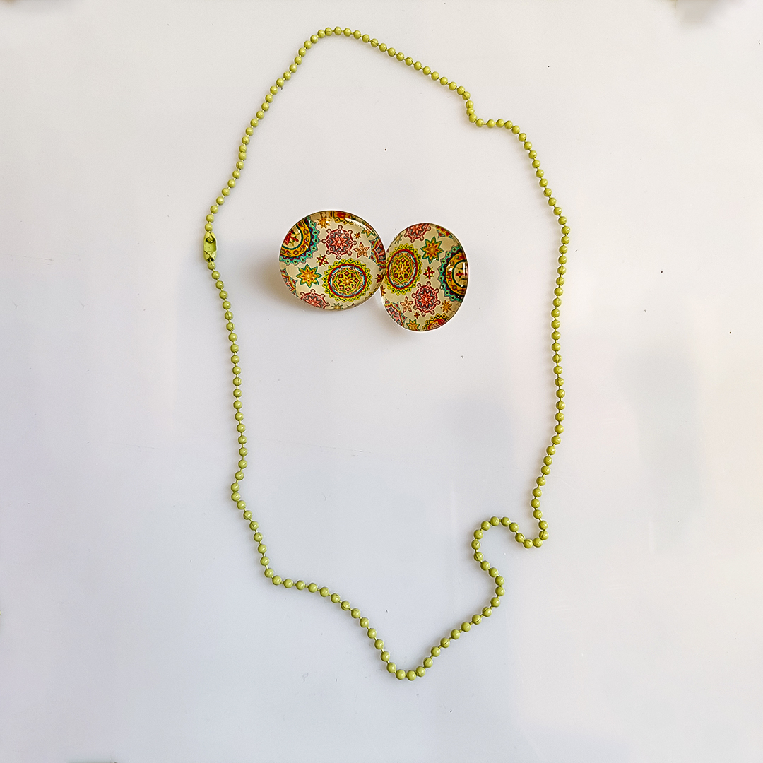 Elevate your look with this stunning Spring Meadow Floral Charm Jewelry Set, a perfect blend of playful color and whimsical style. This beautiful matching set features eye-catching round stud earrings and a coordinating green beaded necklace. Each earring showcases a vibrant, yellow-based floral print encased under a clear dome, reminiscent of a blooming spring meadow. The delicate green beaded chain perfectly complements the colorful earrings, adding a fresh and lively touch.